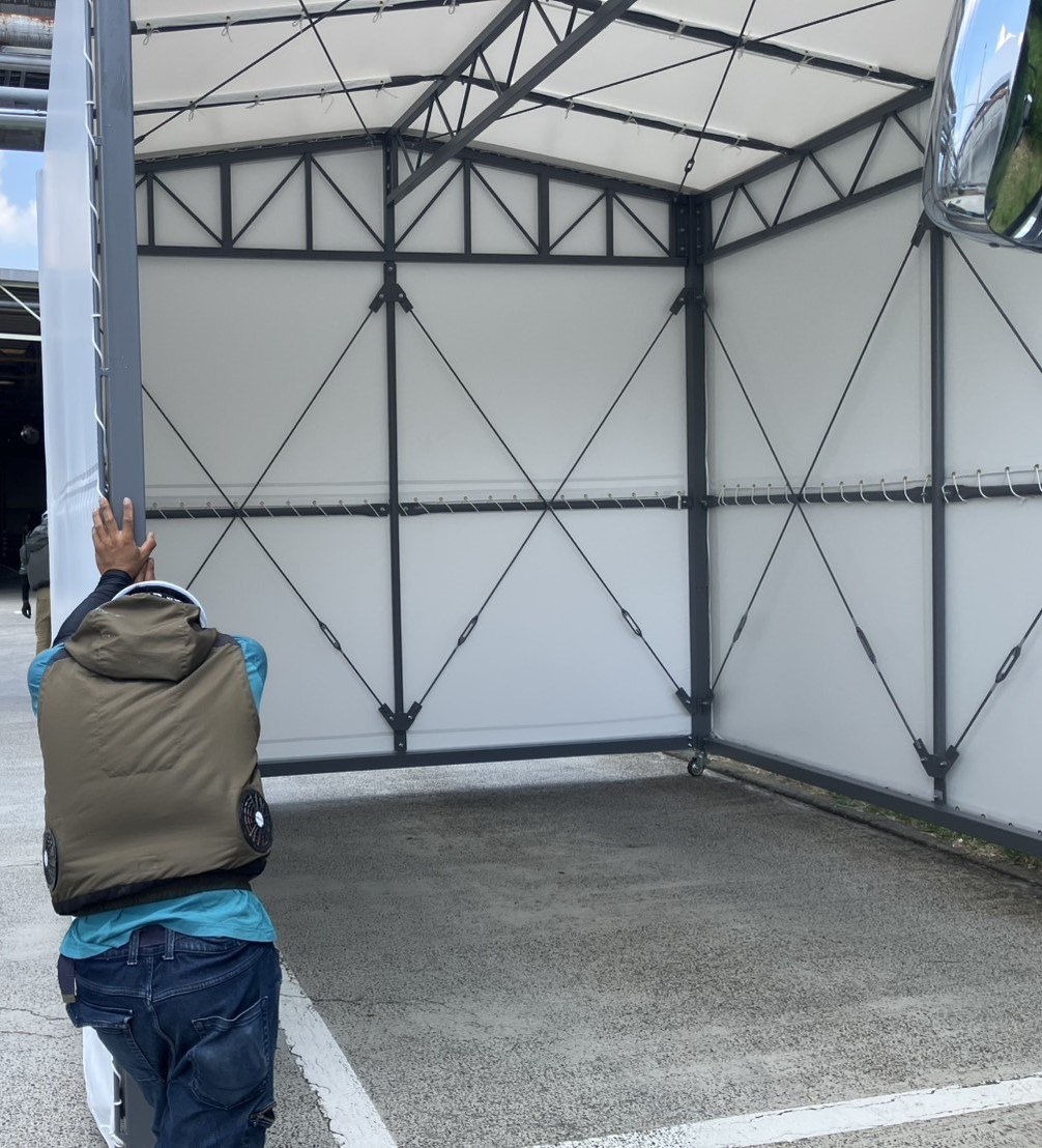 倉庫横の空きスペースにキャスターテントを新たに設置しました。テントシートには軽量で扱いやすく、防炎・防水に優れたシートを使用しており、車輪付きで移動が可能なため、荷物の一時的な仮置き場所としてはもちろん、作業スペースとしても柔軟に活用できます。天候や作業内容に応じて位置を変えることができ、アンカーで固定して使用もできるため現場の状況に合わせて対応が可能になります。
