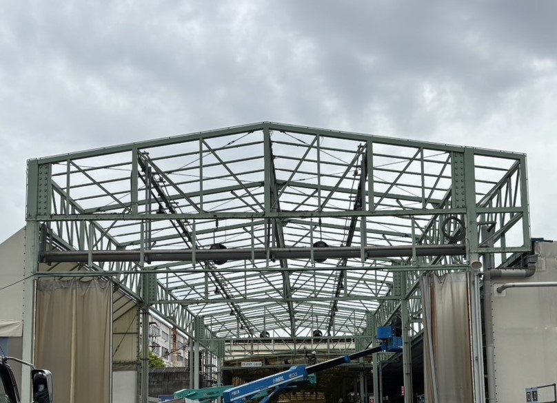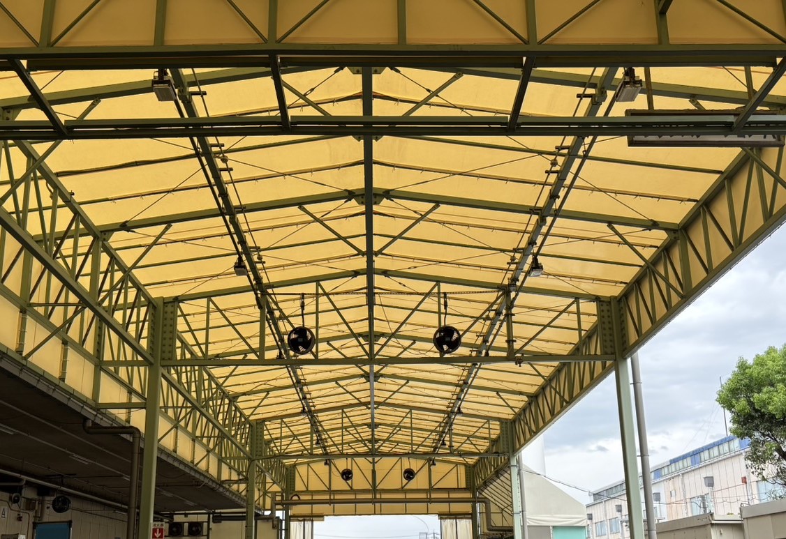 老朽化していたシートの張替工事をおこないました。鉄骨部分は既存のものを活かし、シートのみを高耐久素材「ウルトラマックス」に交換しました。