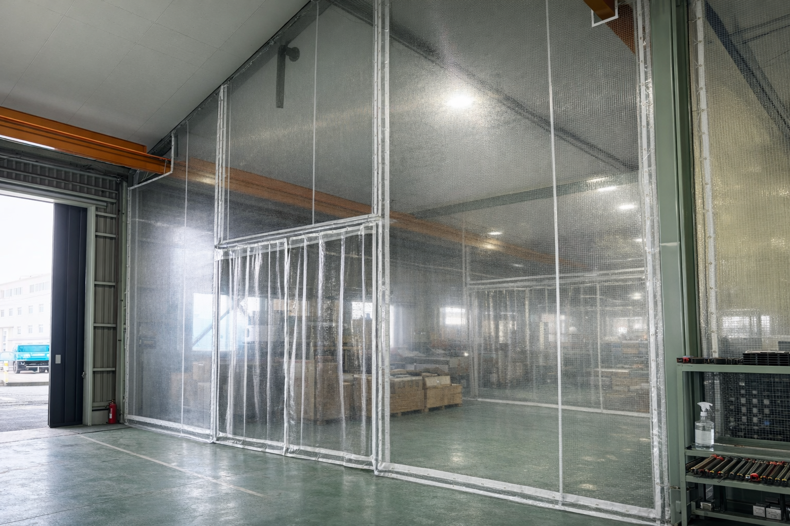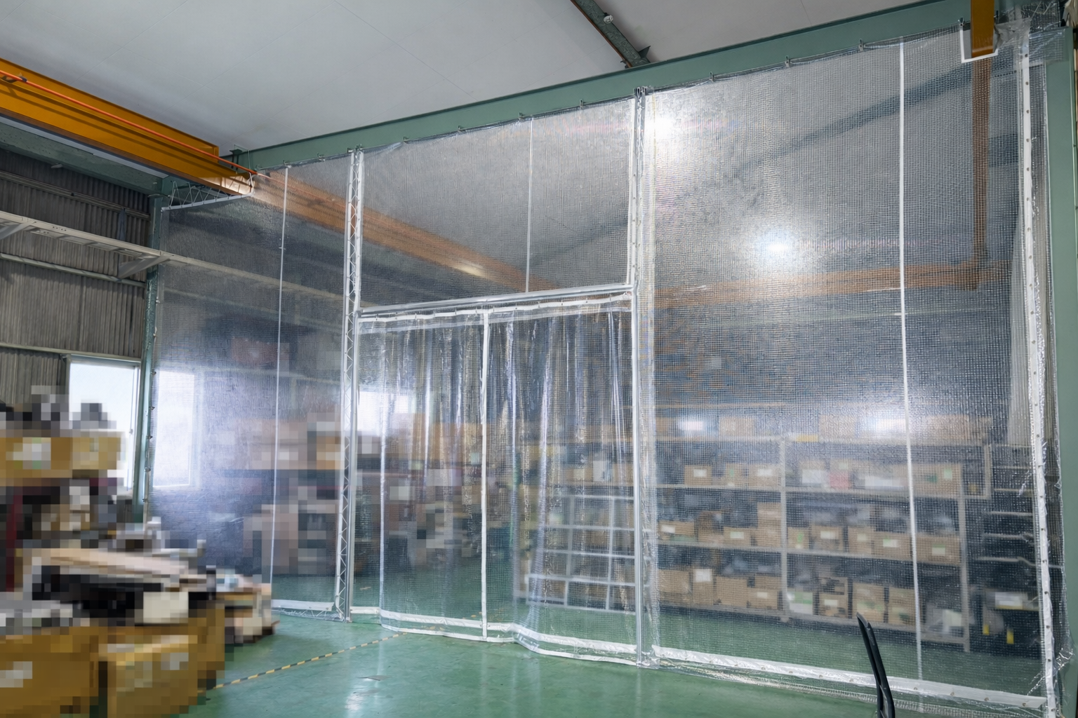 工場内の空調効率向上を目的として、糸入り透明シートによる間仕切り工事を施工いたしました。