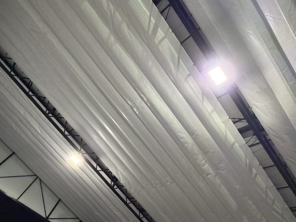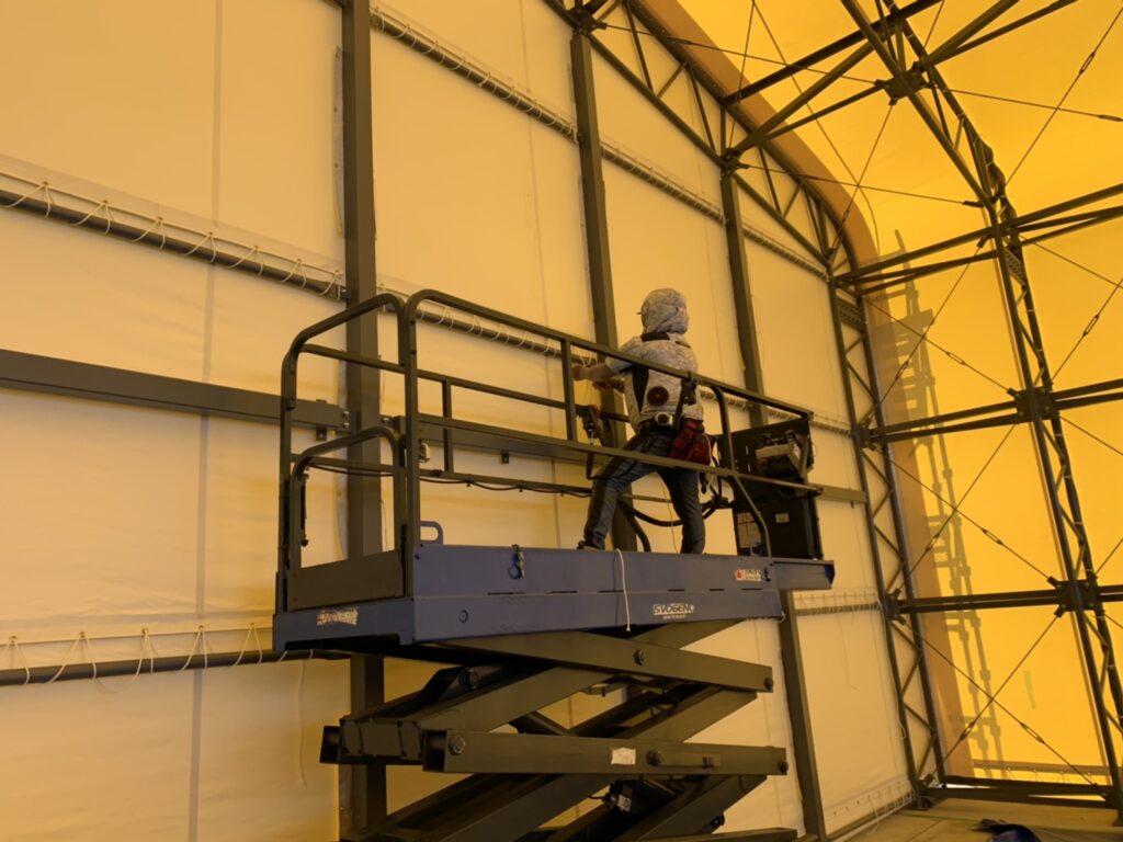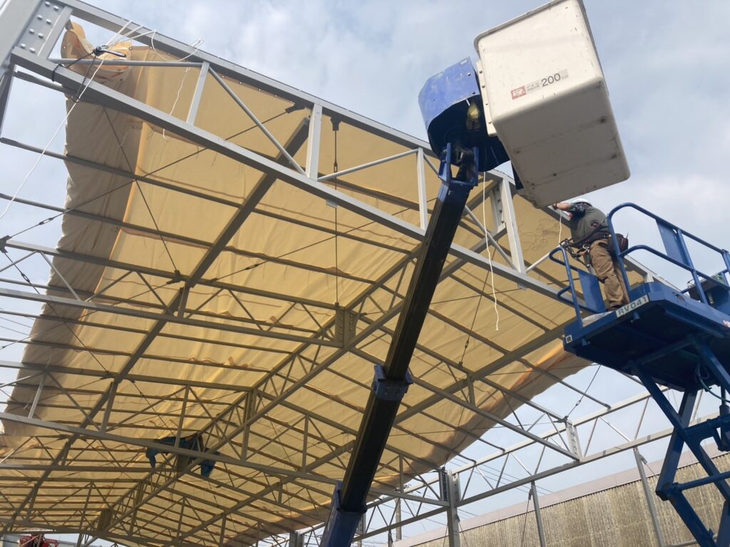 また、この膜材は屋根および桁行方向の壁が一体化しており、重量は何百キロにも及びます。